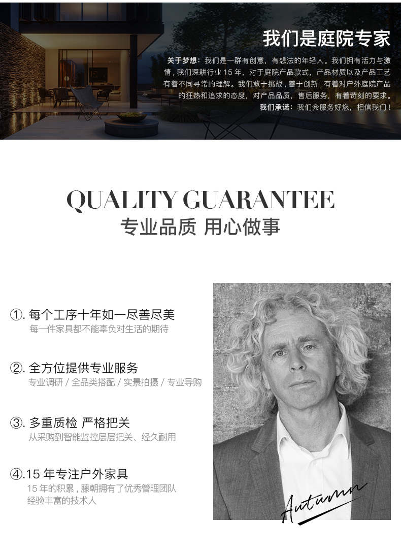华弘多年的坚持和梦想创造了一个充满“优雅”又不失亲和力的庭院世界。这个世界充满着传 承和创新,我们用庭院休闲的方式来表达自我、望造自信,让人们在来舒适和体贴,幸福和喜悦中度 过每一个难忘的时刻。与此同时华弘也是是一家综合型互联网户外家具公司,长期专注于户外家具的研发、生产与销 售坚持品质十年如一的匠心精神,并赢得广大消费者的一致好评;十年磨砺,不断提升品牌实力,目 前华弘品牌产品远销海内外。我们的研发之路,不断探索,只为更好的提供更舒适的生活享受,目前公司主打产品有:户外遮 阳伞、铸铝桌椅、藤编家具、秋千吊篮、帐篷凉亭等系列产品。生产层层把控,只为用心做好每一 件家具,让消费者买得放心,用得舒心。坚持“用心服务,客户至上”的服务宗旨;凭借丰富的经验, 团队的技术研发实力,为您提供一站式服务。