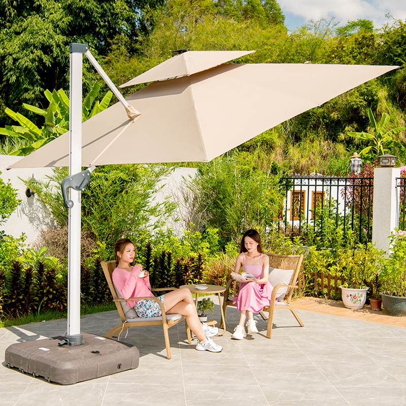 在众多的户外遮阳伞中,罗马伞遮阳伞是功能最强大的一款,它可以旋转360度,亦可以倾斜90度,伞面方向自由移动的优点可以随意地把阳光挡住,用罗马伞遮阳伞不仅能遮阳而且可以在伞下摆放其他户外家具,让人们尽情享受户外时光,因此罗马伞遮阳伞被广泛应用。小编建议大家可以按照藤朝户外家具所生产的铝合金罗马伞作为参考,框架结构采用优质铝合金支架8根伞骨支撑,喷塑烤漆的处理使得伞柄色泽亮丽,长期使用也不易掉漆,性价比高且耐用。伞面采用高性能防水涤纶布,防紫外线性能好,高色牢度、不易褪色、遮阳防雨、持久耐用,与其他罗马伞遮阳伞不同的是,藤朝户外家具的罗马伞遮阳伞拥有双顶设计,手摇式开合,可以多个档位上下调节伞面,360度任意调节遮阳角度。