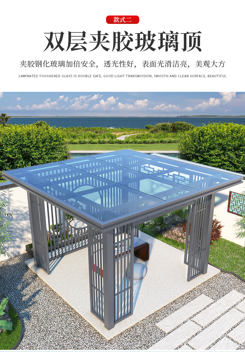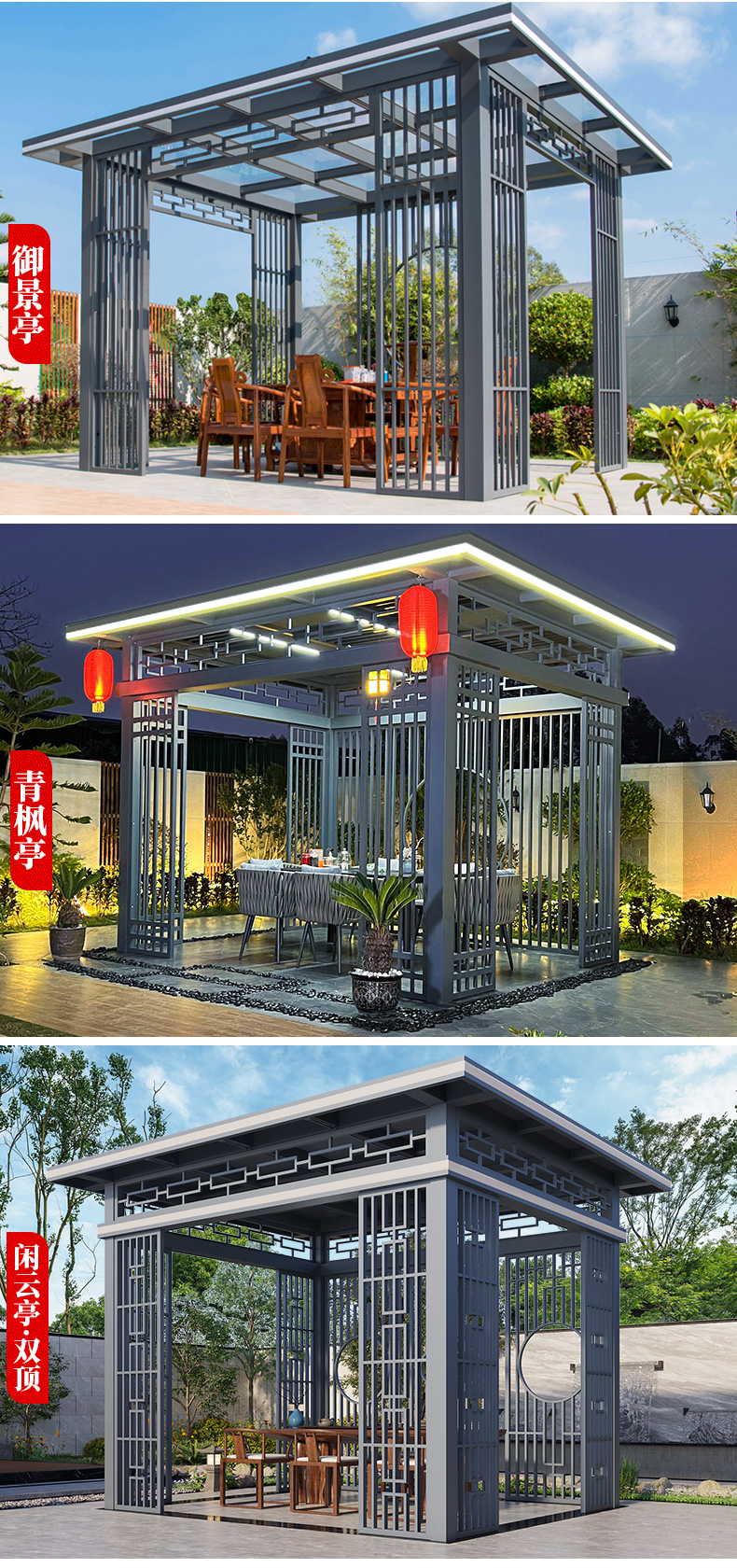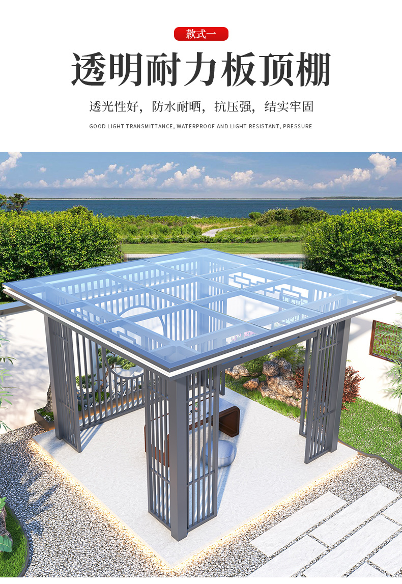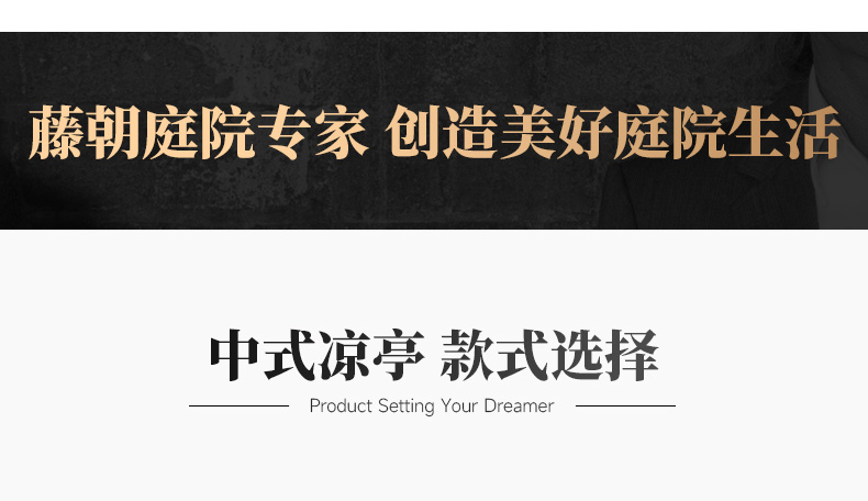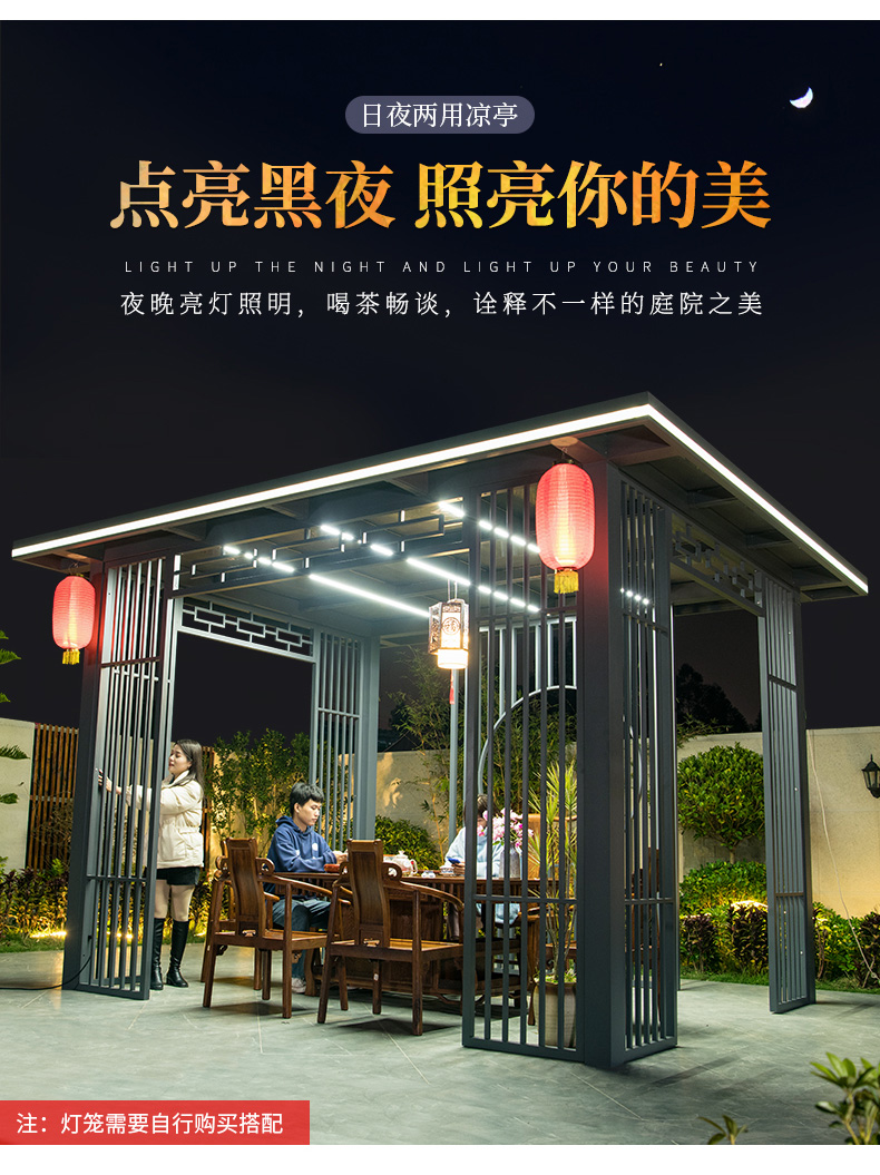 产品简介:日夜两用中式庭院凉亭,三款顶棚可选...