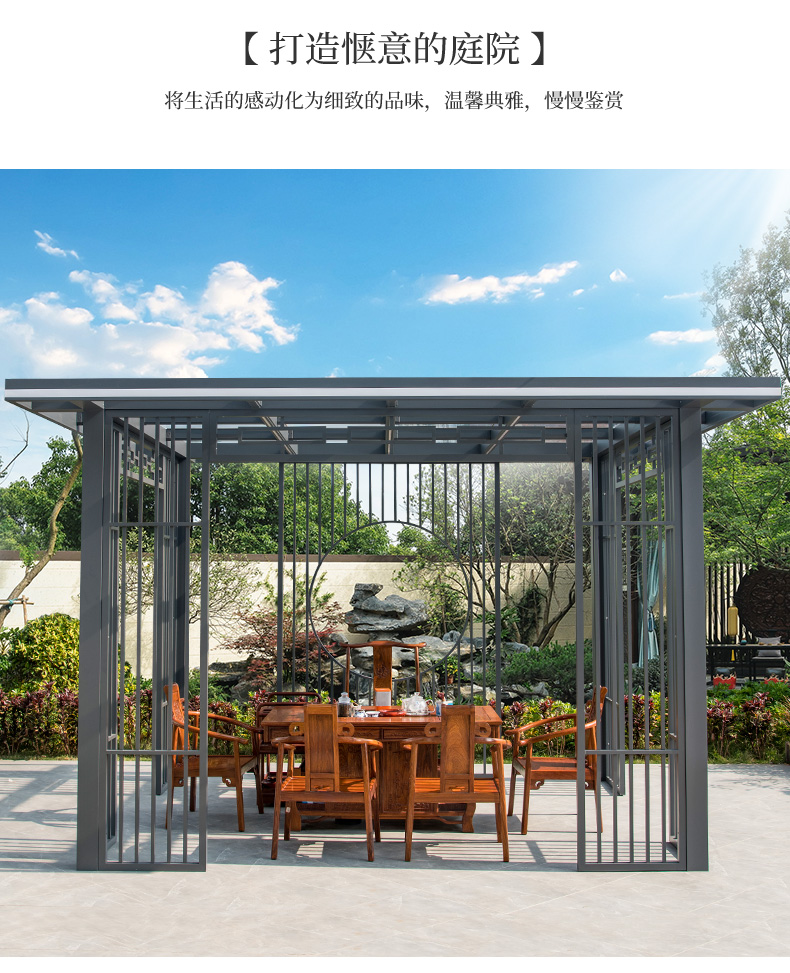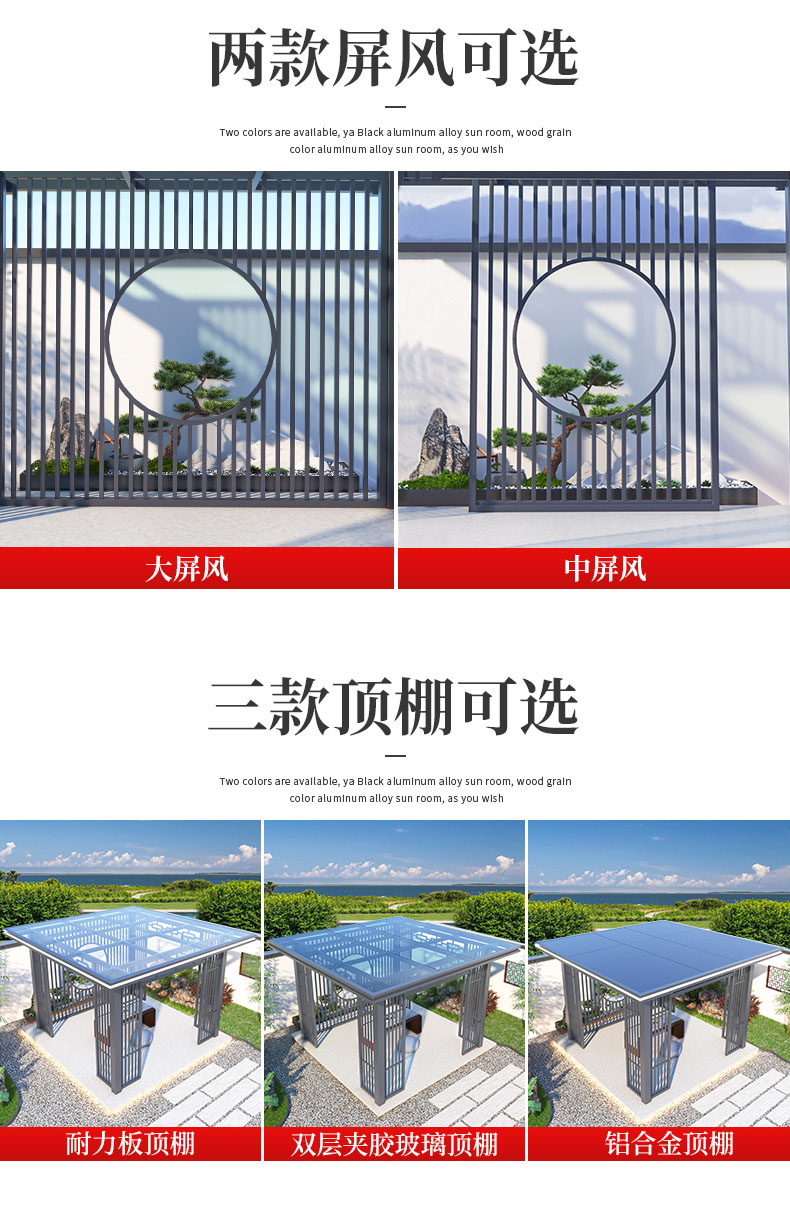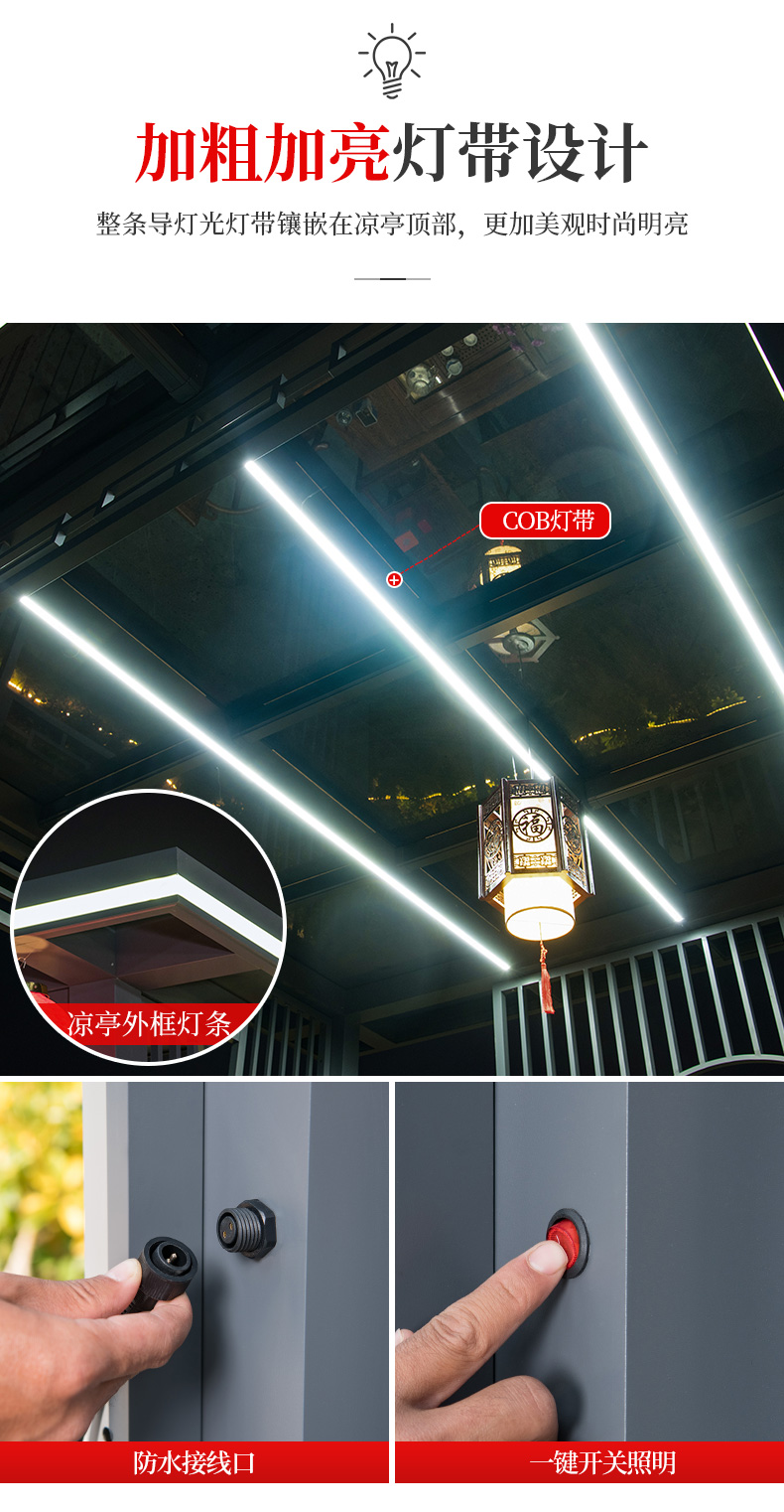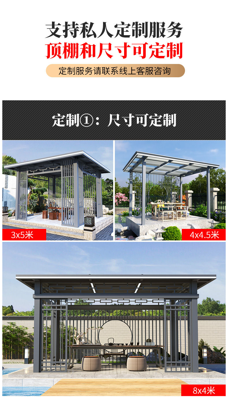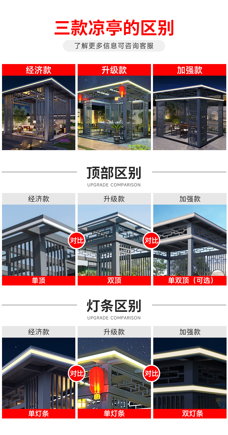 产品简介:日夜两用中式庭院凉亭,三款顶棚可选...