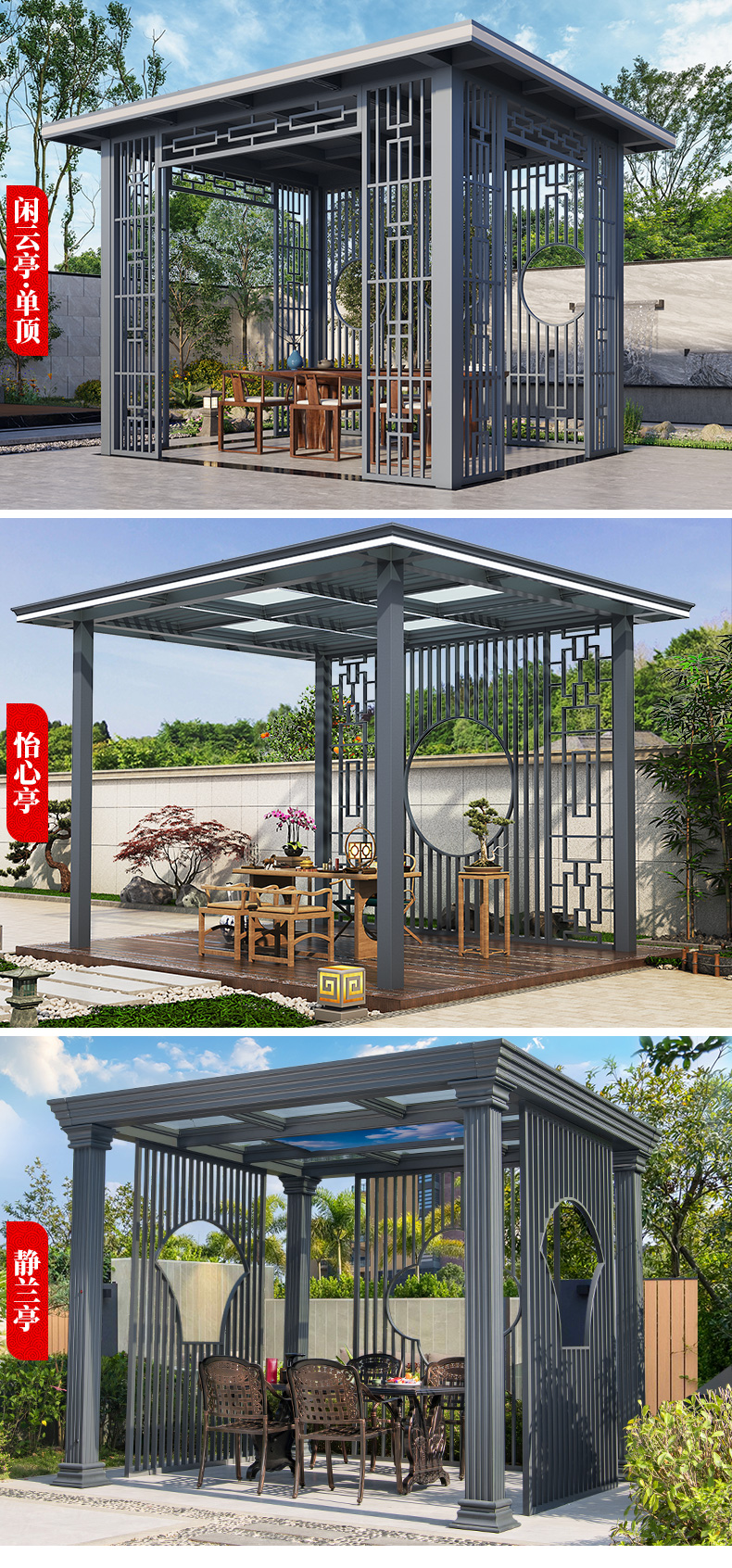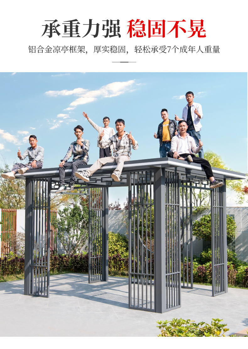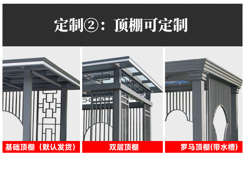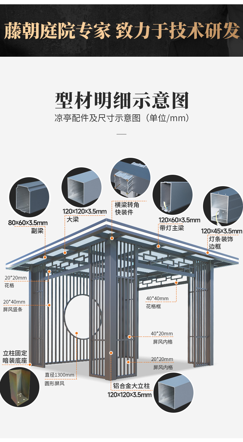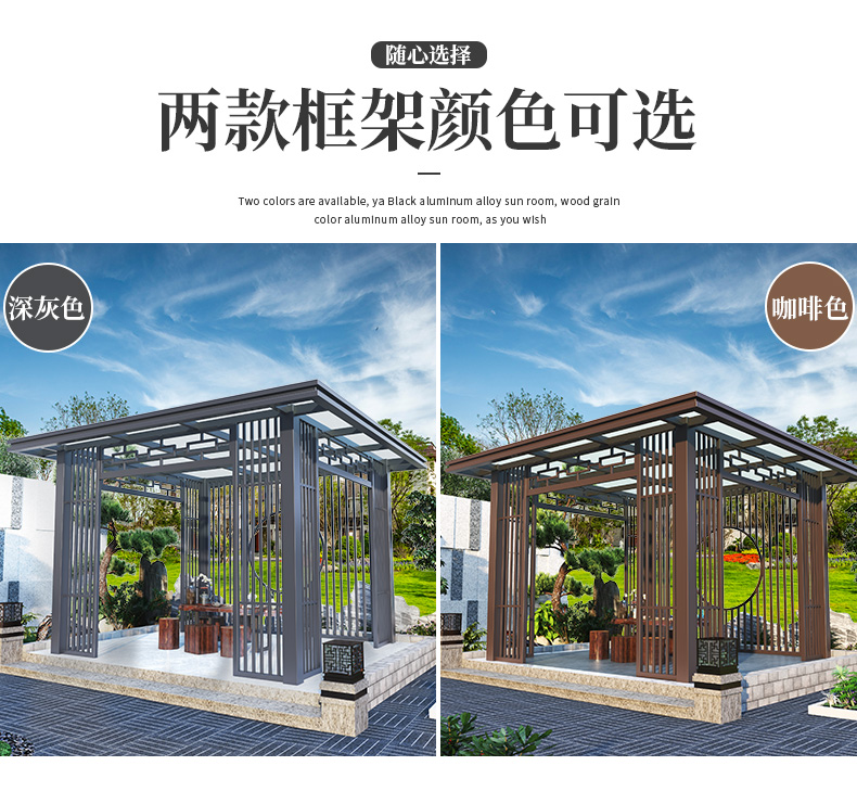 产品简介:日夜两用中式庭院凉亭,三款顶棚可选...