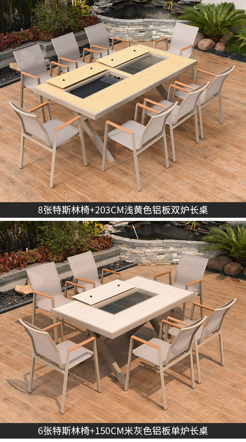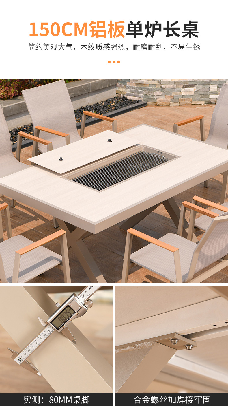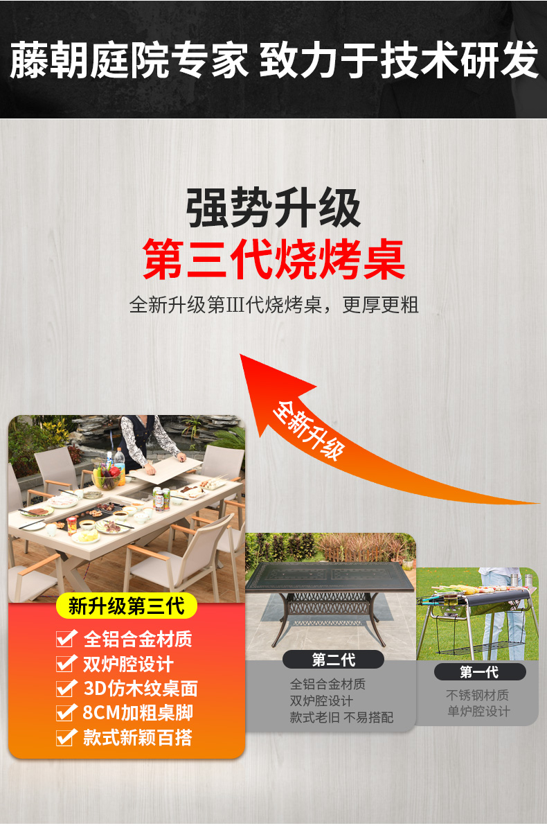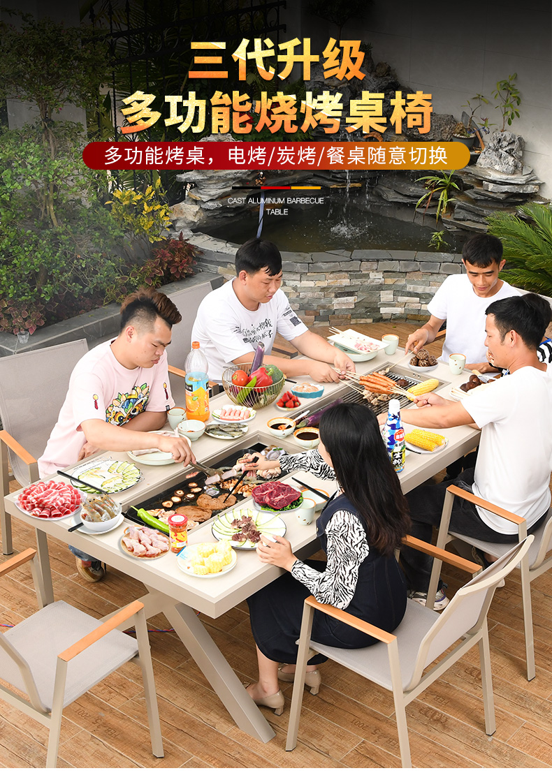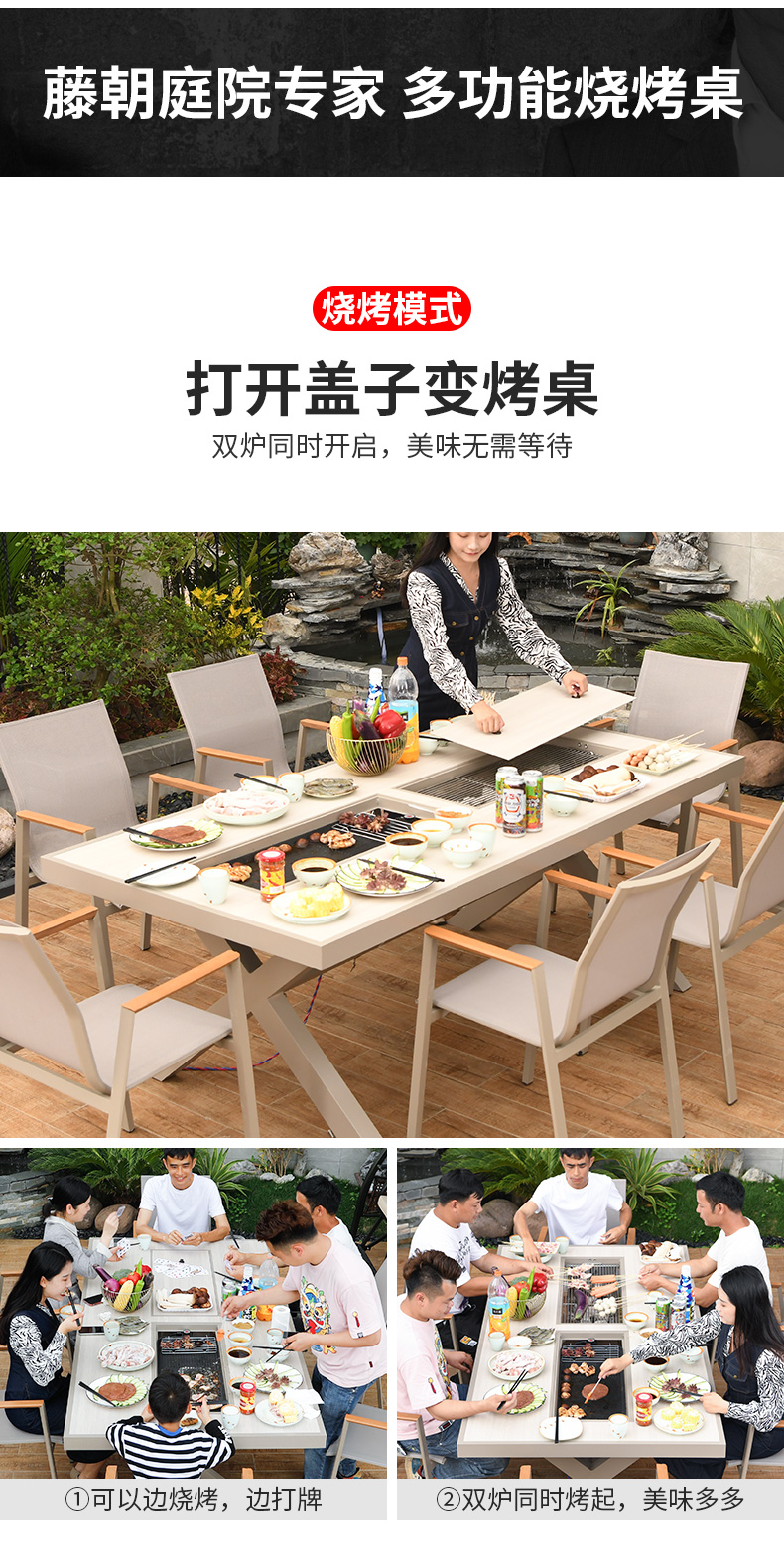 产品简介:藤朝中式庭院烧烤桌椅户外铝合金碳烤两用桌椅家用室外电烤长桌椅...