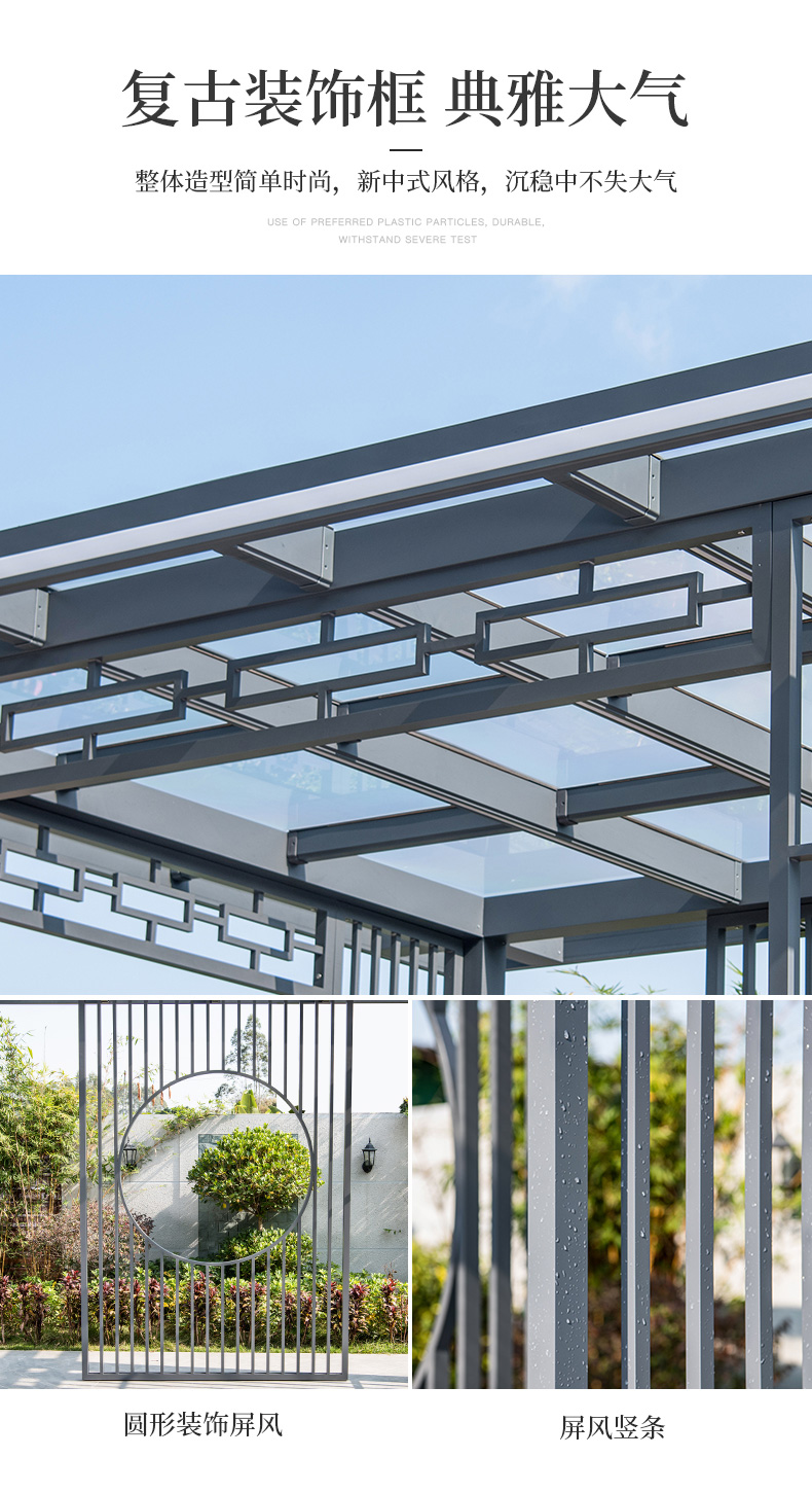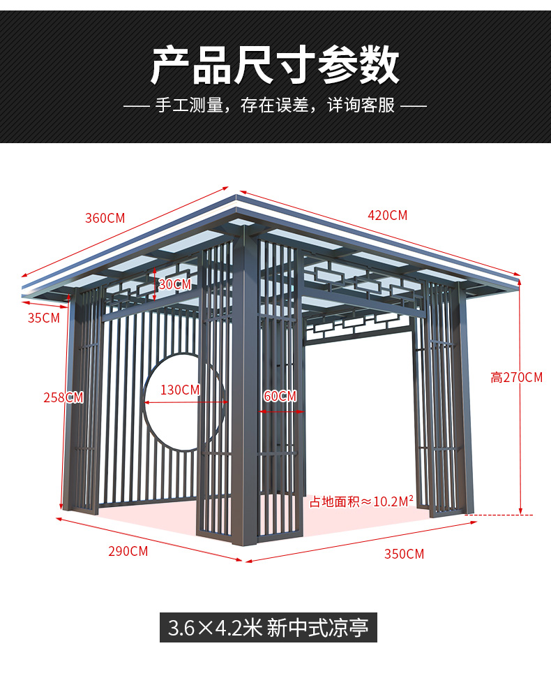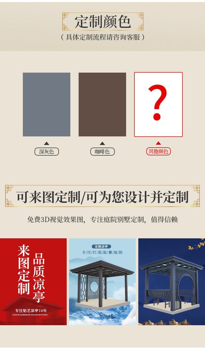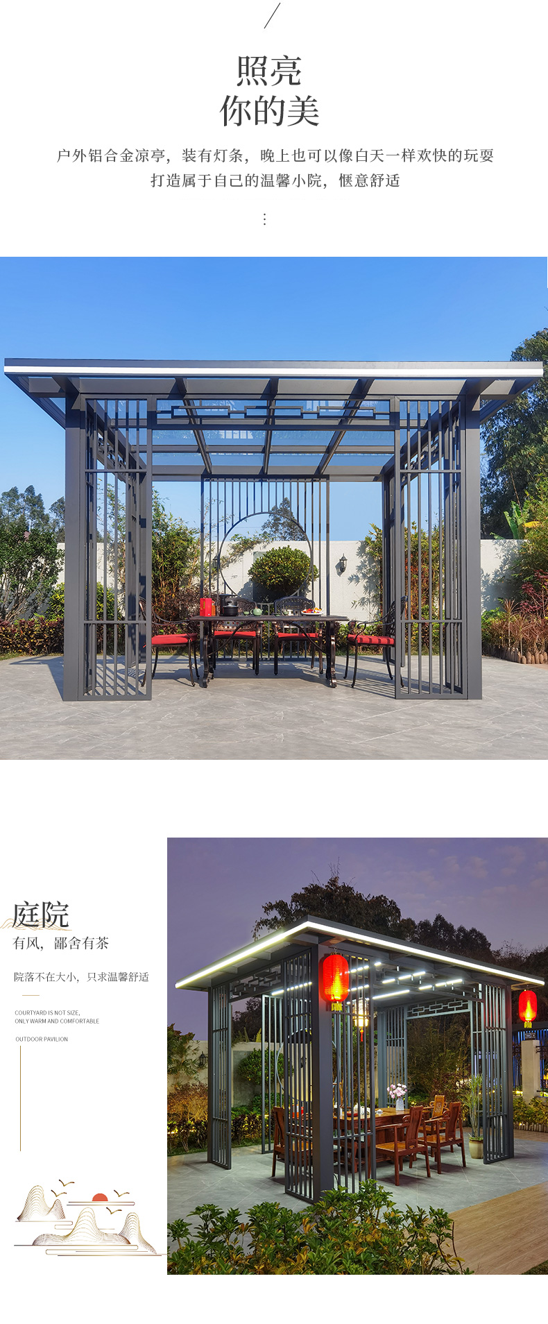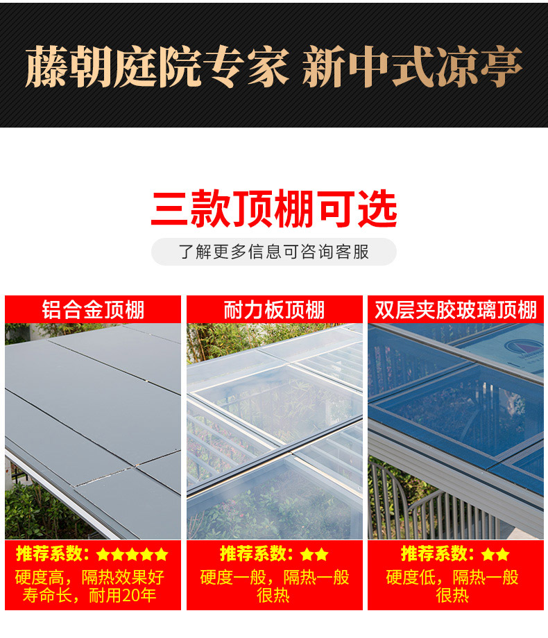 产品简介:日夜两用中式庭院凉亭,三款顶棚可选...